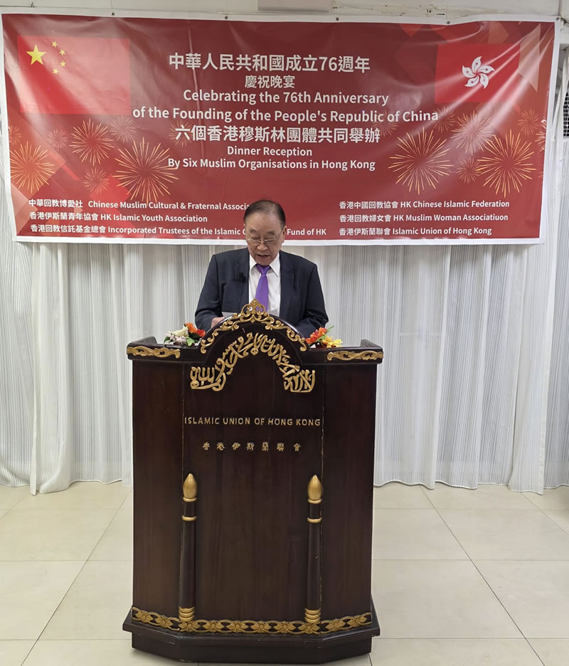 2025年9月27日星期六,香港伊斯蘭中心食堂,洋溢著喜慶氛圍,香港六大伊斯蘭團體聯合舉辦「慶祝中華人民共和國成立76周年聯歡晚會」,筵開十二席。是次活動由香港回教信託基金會、香港中國回教協會、香港伊斯蘭聯會、香港回教婦女會、中華回教博愛社及香港伊斯蘭青年協會共同主辦。