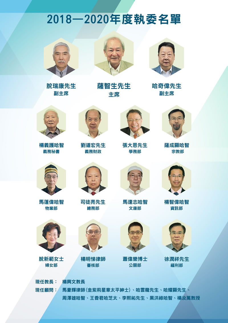 主 席:脫瑞康先生 副 主 席:哈奇偉先生副 主 席:張大恩先生(兼任學務部)副 主 席:薩成顯哈智 (兼任宗教部)副 主 席:徐潤祥博士(兼任福利部)義務秘書:楊義護哈智義...