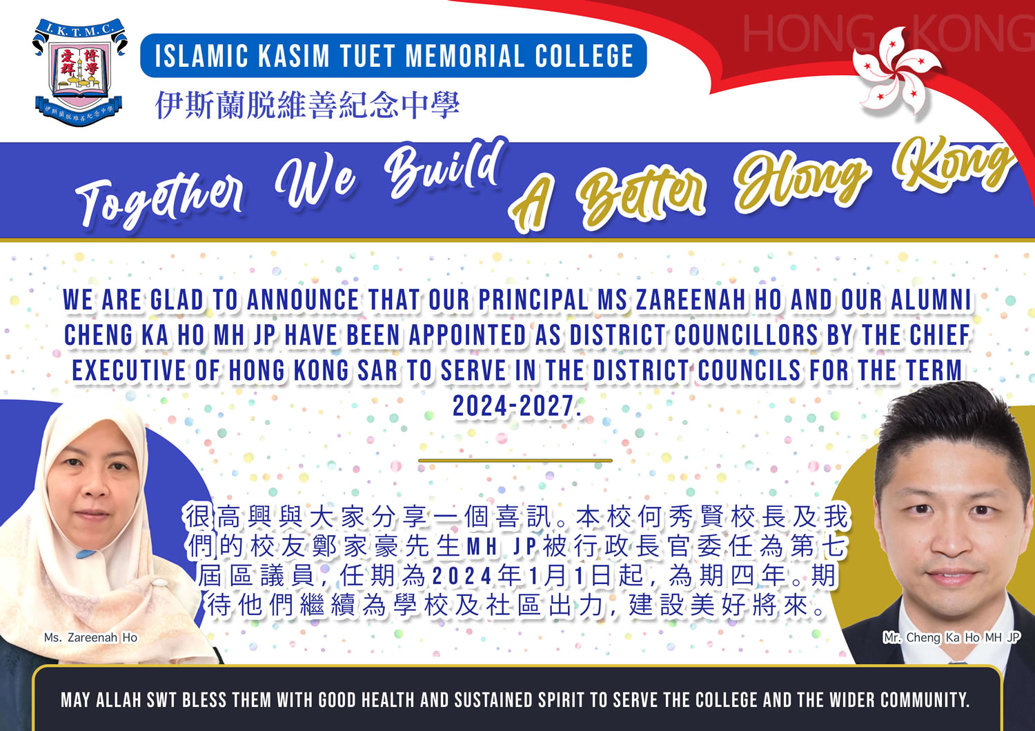 伊斯蘭脫維善紀念中學何秀賢校長及校友鄭家豪先生MH JP被行政長官委任為第七屆區議員,任期為2024年1月1日起,為期四年。期待他們繼續為學校及社區出力,建設美好將來。 ...