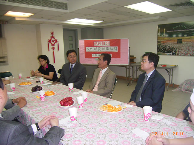 上午九時卅分沈沖部長在鄭海燕處長、李明先生陪同下來到本社,脫主席及各執委致以熱烈的歡迎,主客在本社一樓展開親切的座談。首先由主席、秘書長向沈部長簡單介紹了博愛社的歷史及活動情況,以及未來的發展,而哈奇偉校監亦向沈部長介紹了伊斯蘭脫維善紀念中學的近況。