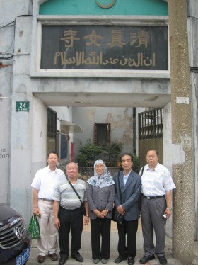 訪問團落機後首先參觀了小桃園清真寺,該寺原名清真西寺,原位於城內西部。現已於1925年(回曆1343年)改建成現今面貌,該寺大阿訇為白潤生教長,現任上海市伊斯蘭教協會會長,我們下機後不久,便由金宏偉阿訇及馬勇阿訇陪同,直達小桃園清真寺,白潤生會長親自安排在該寺的二樓設宴招待;該二樓主要為會議室或在開齋節及古爾邦節時,用來禮拜。設宴之用,還是首次,可見其熱情,非常難得。